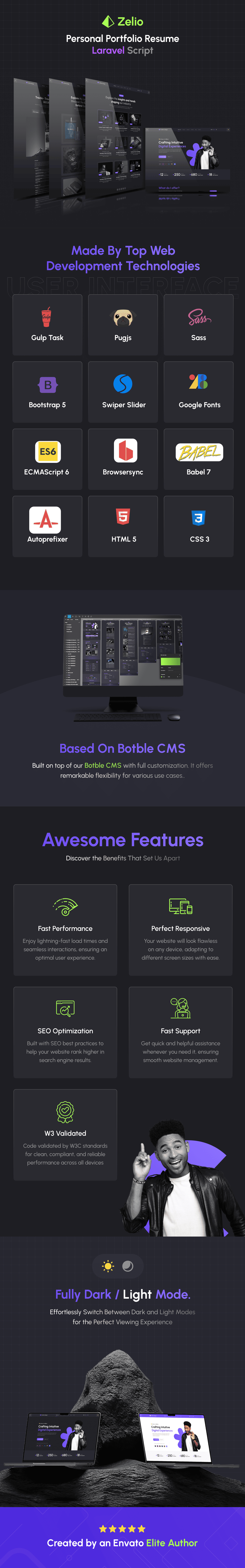 Zelio – Skrip Laravel untuk Resume Portofolio Pribadi Tunjukkan keahlian dan kreativitas unik Anda dengan Zelio, skrip Laravel canggih yang dirancang khusus untuk portofolio pribadi. Sempurna untuk pekerja lepas, desainer, seniman, dan kreator dari semua jenis, Zelio menawarkan desain kontemporer yang ramping yang memastikan karya Anda bersinar. Dengan beragam gaya portofolio, Zelio adalah templat yang sempurna untuk memamerkan karya Anda. Tema ini dilengkapi dengan 3 beranda bawaan dan dibangun di atas inti Botble CMS kami. Tema ini juga mudah digunakan dan mudah dimodifikasi sesuai kebutuhan. Tema ini menawarkan fleksibilitas luar biasa untuk berbagai kasus penggunaan.